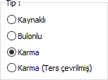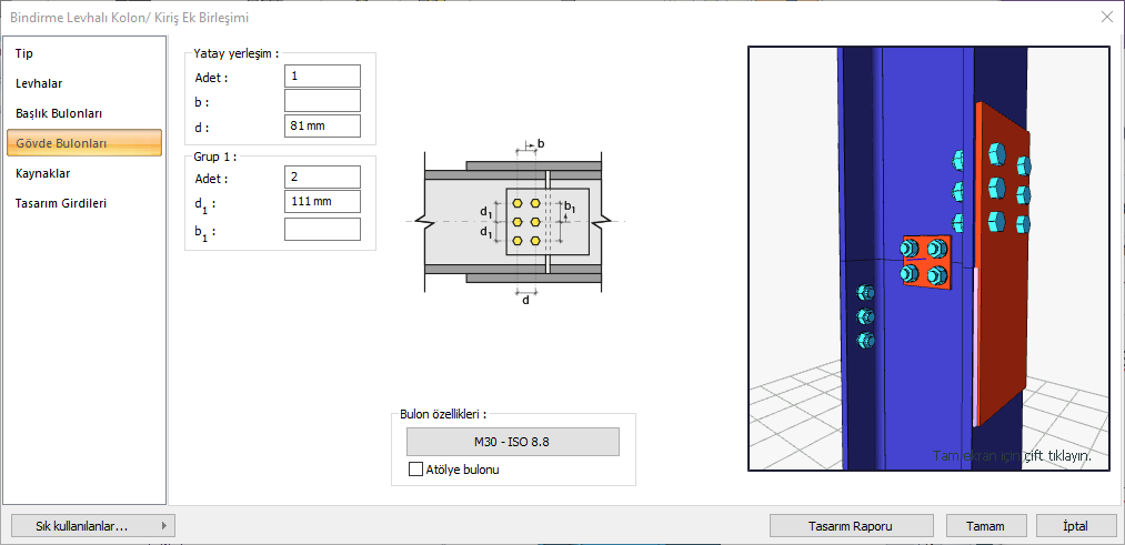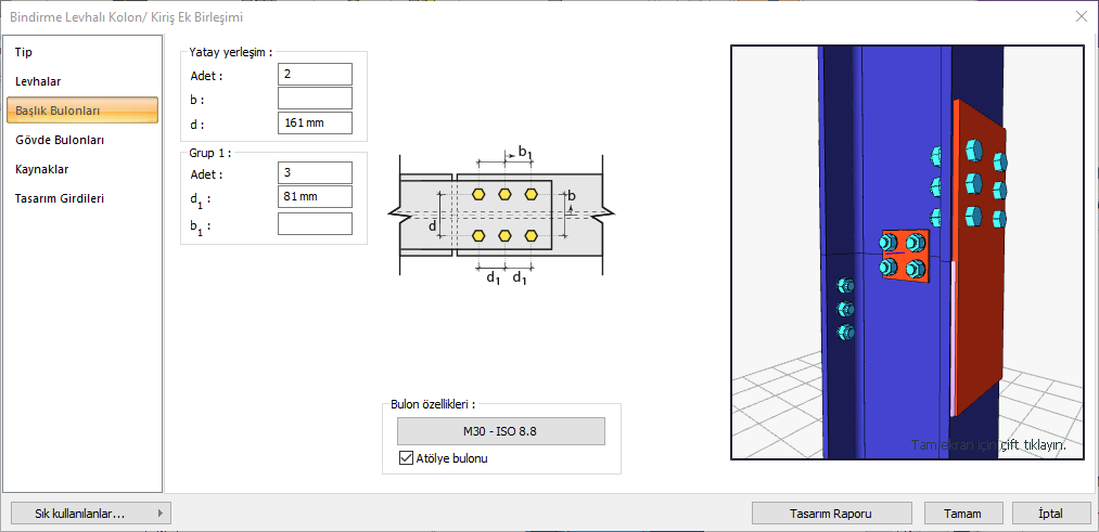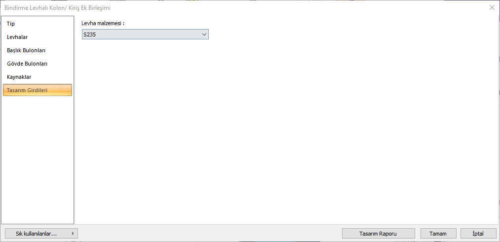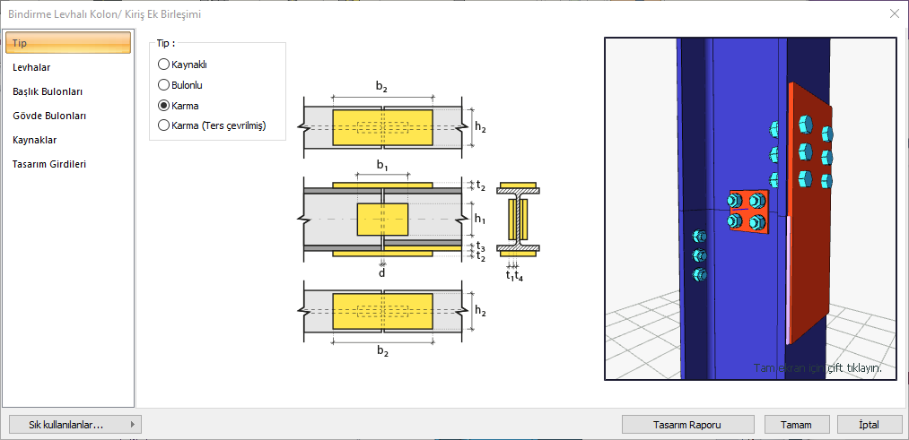 Tip ![]() Bağlantı için kaynaklı, bulonlu, karma ya da karma (ters çevrilmiş) bağlantı tiplerinden biri seçilir. |