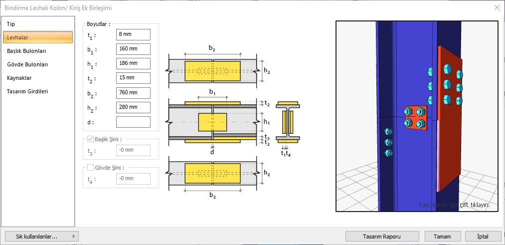 Gövde şimi ![]() Şim, bulonlu birleşimlerde bağlanacak elemanlar arasına yerleştirilen bir levhadır. Şim yapılacaksa seçenek işaretlenir ve t4, kalınlık değeri verilir. |
