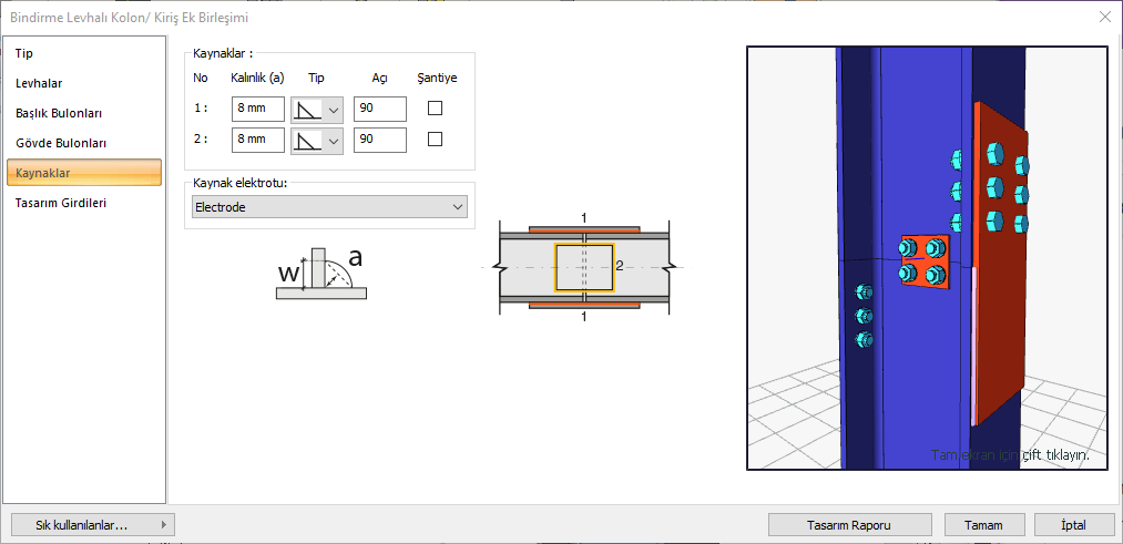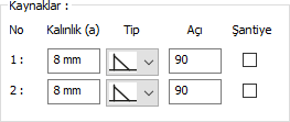Kaynaklar ![]() Birleşim yerlerine yapılacak kaynakların kalınlık, tip ve açı değerleri verilir. Şantiyede yapılıp yapılmayacağı bilgisi girilir. |