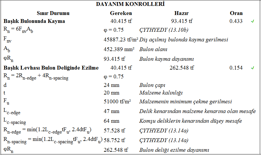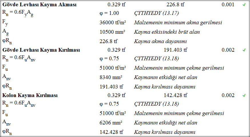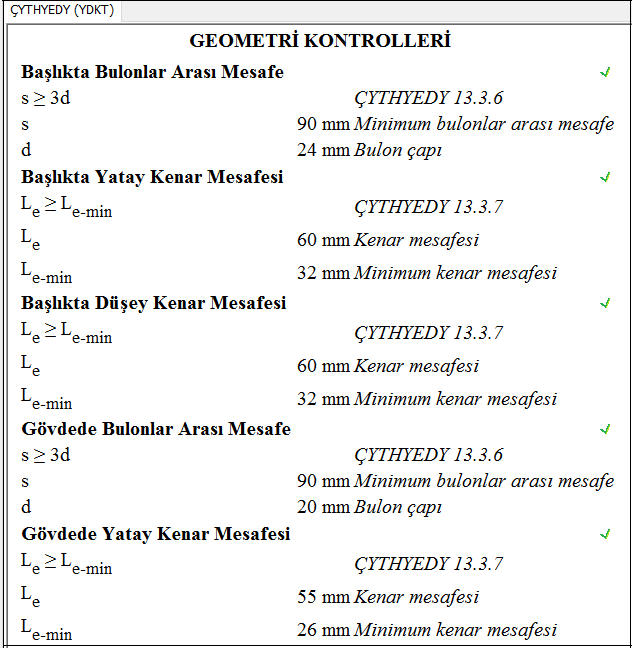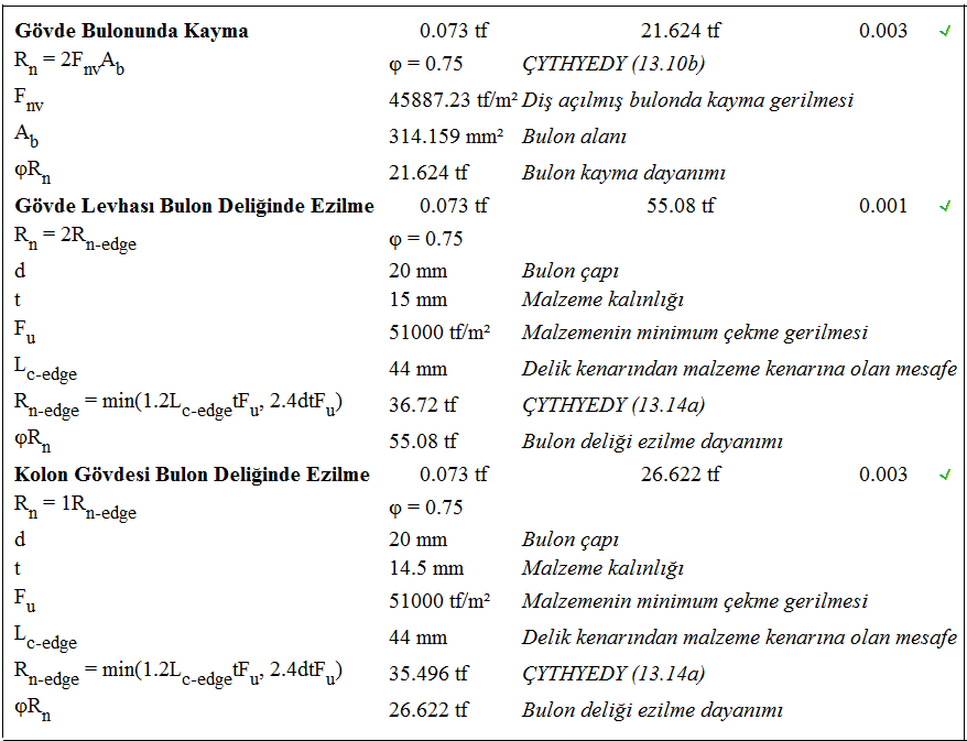 Bindirme Levhalı Kolon/Kiriş Eki tasarımı Çelik Yapıların Tasarım, Hesap ve Yapım Esasları (ÇYTHYEDY), AISC 360-16, yönetmeliklerine göre otomatik yapılır ve birleşim raporu oluşturulur.