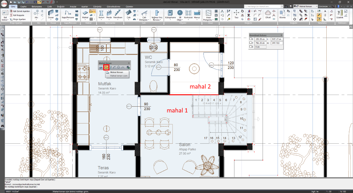 Klasik menüde Çiz/Objeler/Mahal Kenarı/Mahal Kenarı satırı, ribbon menüde Giriş/Mahal/Mahal Kenarı ikonunu tıklayın.