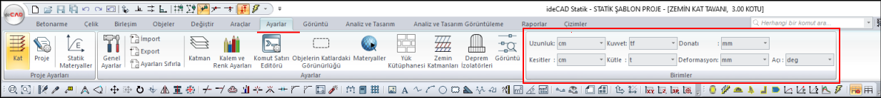 Ribbon Menü/Ayarlar sekmesinden tasarım birim ayarlarının değiştirilmesi