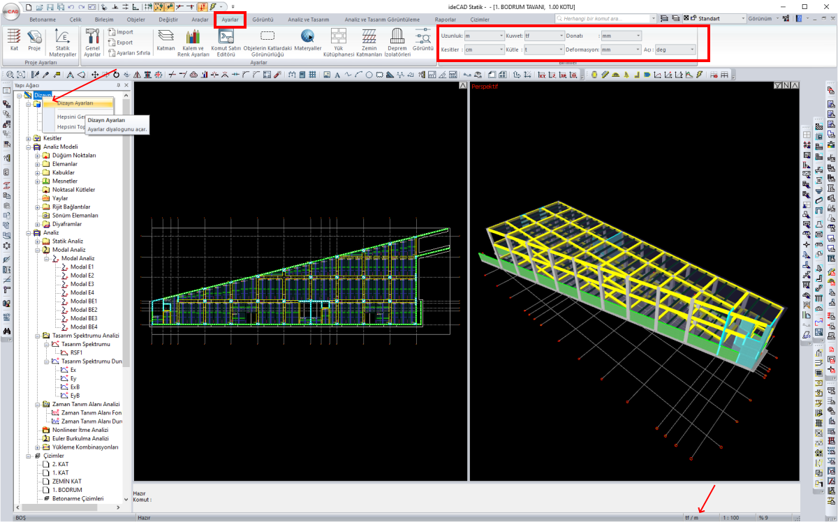 Çalışılan birim sistemi ayarları, "Ayarlar menüsü/Birimler" bölümünden, ekranın sol alt köşesinde bulunan "Birim İkonundan" veya yapı ağacından Dizayn satırı sağ tuş tıklanarak açılan "Dizayn Ayarları" diyaloğundan değiştirilir. Girdi birimleri ve rapor birimleri istenilen şekilde metrik (SI) birim sistemi veya fit-inç (feet-inch) birim sistemi kullanılabilir.