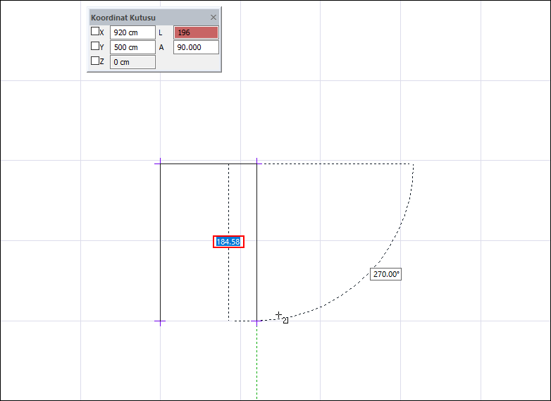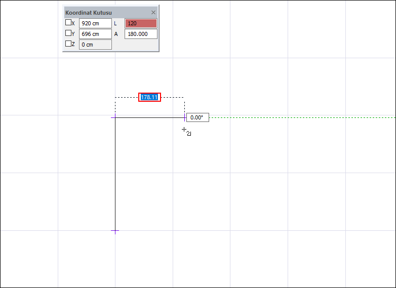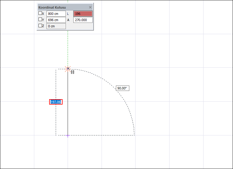 Başlangıç noktasına tıklayın. Uzunluk girmek için klavyeden L tuşuna basın. İmleç koordinat kutusundaki L hanesine gidecektir. Buraya uzunluk değeri olarak 196 (cm) girin ve enter tuşuna basın. Çizilmekte olan çizgi uzunluk değeriyle sınırlanacaktır.