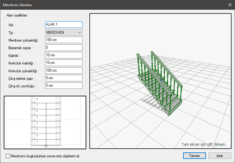 Bu alan merdivenin kolu olacağı için “Tip”, merdiven olarak seçili kalacaktır.