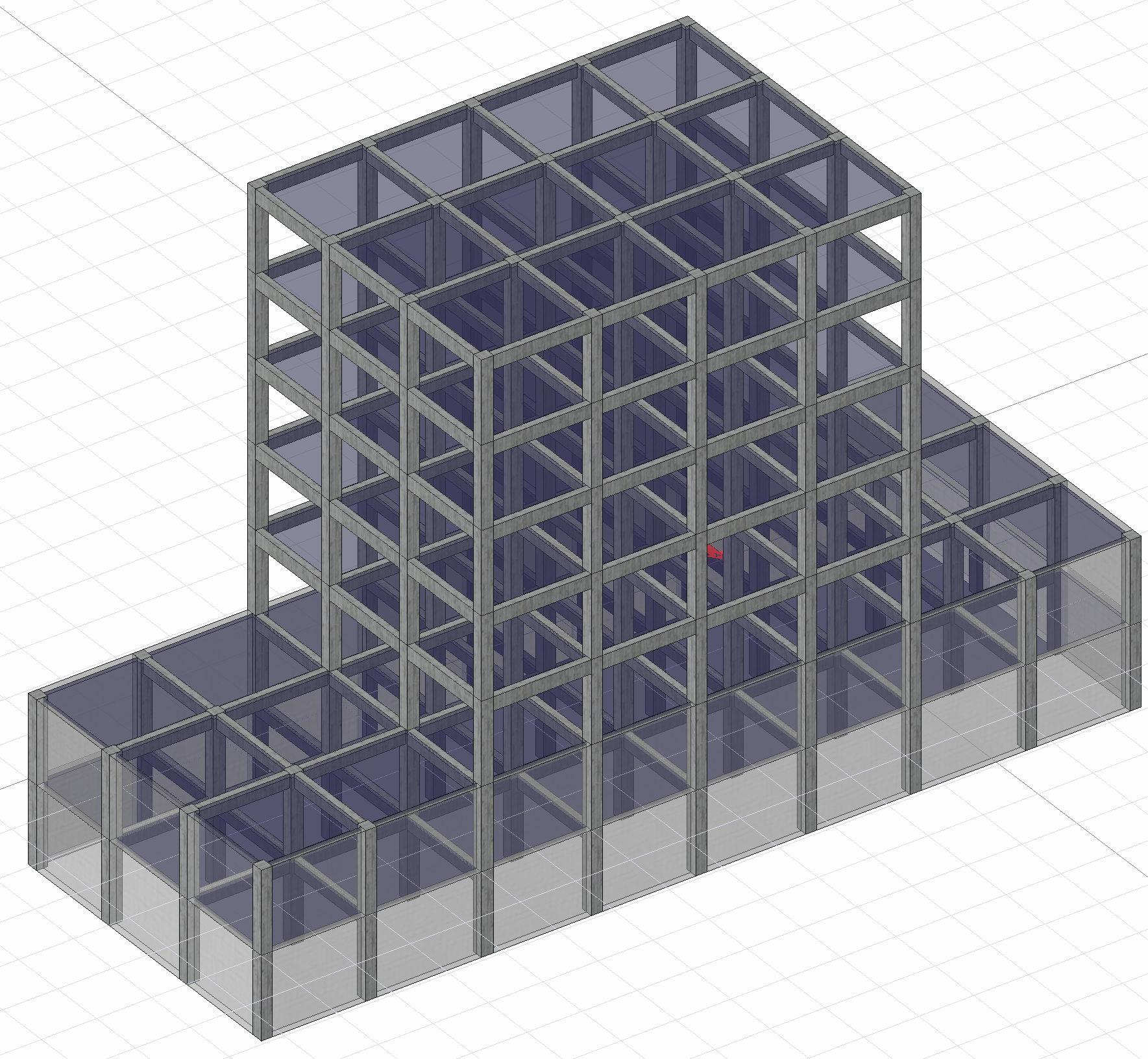 Aşağıdaki resimde görüldüğü gibi, 2 bodrum kat, 5 normal kat bulunan bir binada rijit bodrum perdeleri dışında bir perde tanımlanmamıştır. Bu tür bir binanın Tablo 4.1 'e göre taşıyıcı sistem seçimi yapılırken rijit bodrum perdeleri gözönüne alınmaz. Bu nedenle aşağıda gösterilen binanın taşıyıcı sistemi, deprem etkilerinin tamamının süneklik düzeyi yüksek(veya sınırlı) betonarme çerçeveler ile taşındığı binalar sınıfına girebilir.