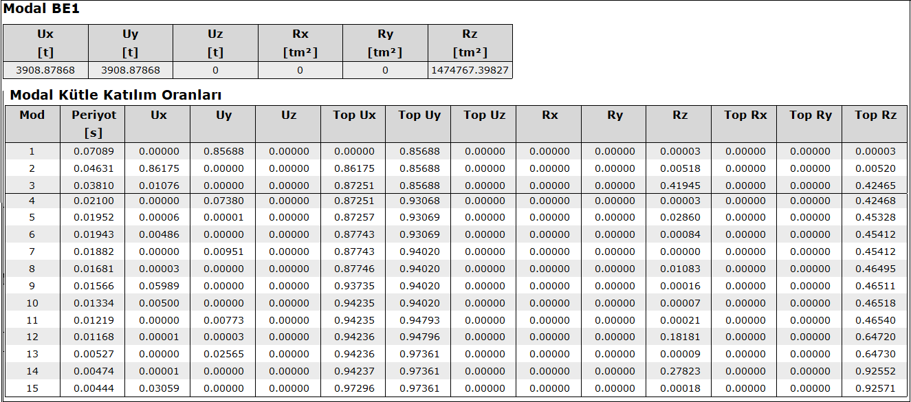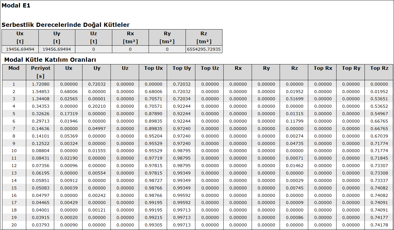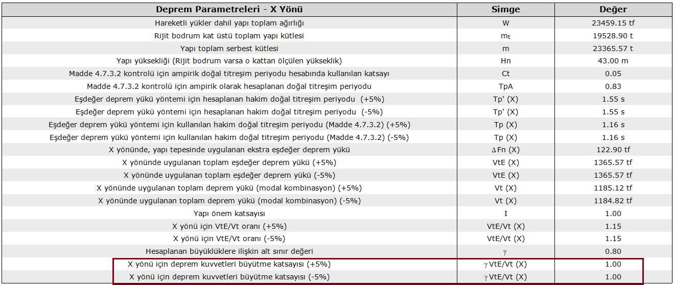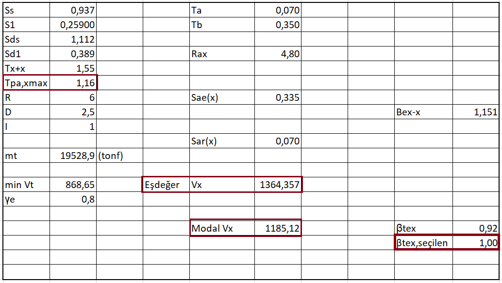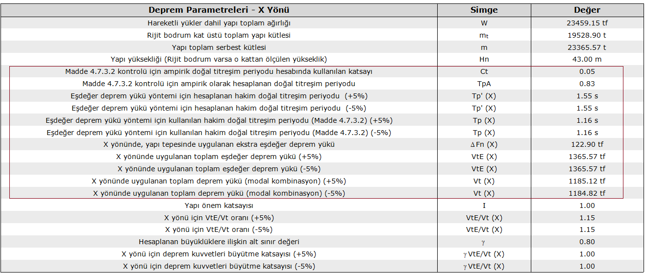 - Yukarıda elle yapılan hesap ideCAD tarafından otomatik yapılır ve dinamik analiz raporu giriş bölümünde detaylandırılır. Aşağıdaki tablo dinamik analiz raporundan X yönü için elde edilmiştir.