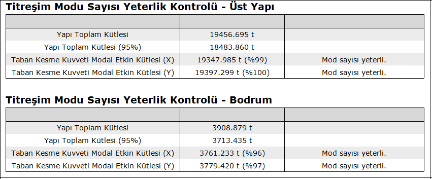 - Bina bodrumlu bir yapı olduğundan, rijit bodrum perdelerinin üstünde yer alan üst bölüm ile bodrum katlarını içeren alt bölümün tümü için Mod Birleştirme Yöntemi’nde hesaba katılması gereken yeterli mod sayısını, kütle katılım oranı % 95, sağlamak zordur. Bu nedenle TBDY 2018 4.8.5.1’de bodrumlu binaların modal hesap yöntemleriyle hesabında iki yükleme durumlu hesap yapılır.