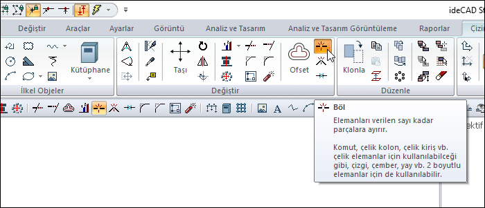 Böl komutuna ribbon menü Çizimler sekmesi Değiştir başlığı altından ulaşabilirsiniz.