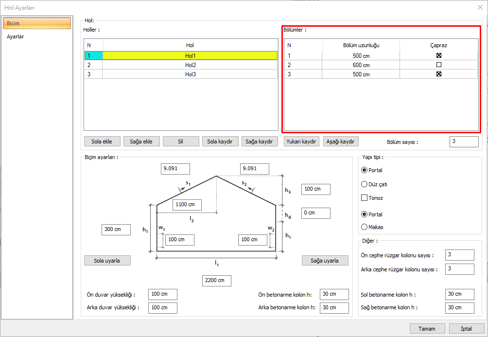 Bölüm uzunluğu özelliği ile hol ayarları diyaloğunda seçilen holdeki seçilen bölüm uzunluğu değiştirilir.