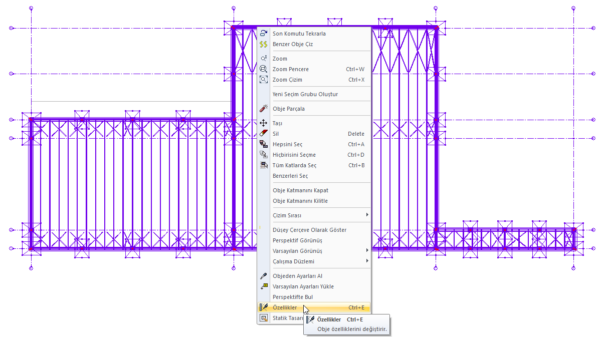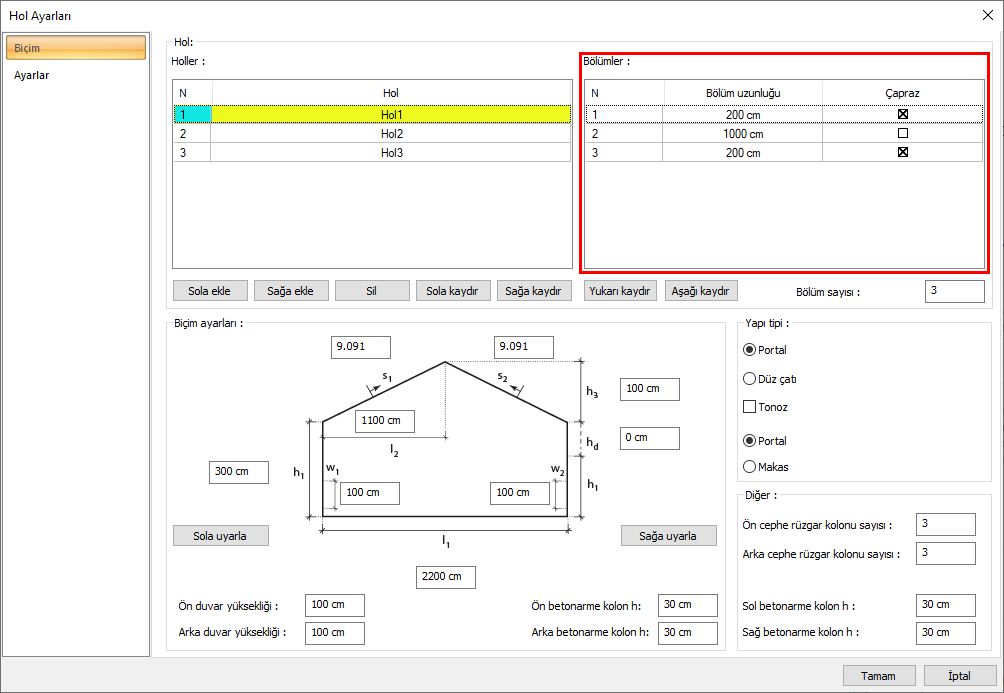 Çapraz özelliği ile hol ayarları diyaloğunda, seçilen holdeki seçilen bölümlere çapraz eklenir, mevcut çaprazlar kaldırılır.