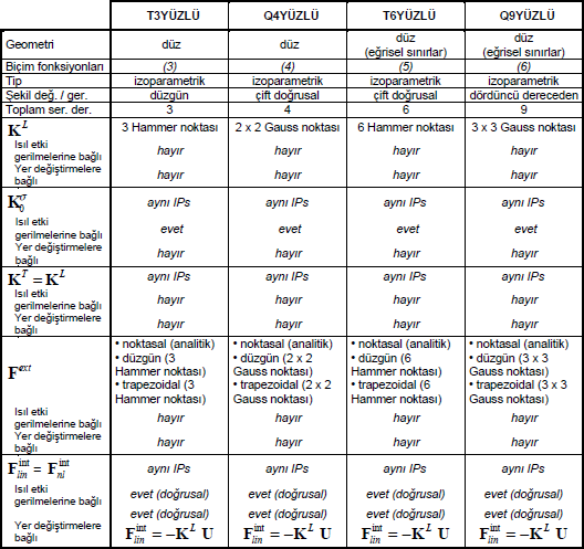 Bu elemanların kalınlıkları düzgün ve benzerdir (tek değer tanımlanmış halde). Bütün elemanlar model tanımının düzlemi içinde olmalıdır. İkinci dereceden elemanlar olan T6 ve Q9 eğrisel olamaz (ancak sınır hatları olabilir).