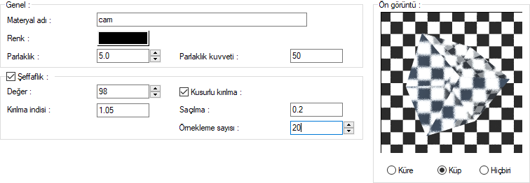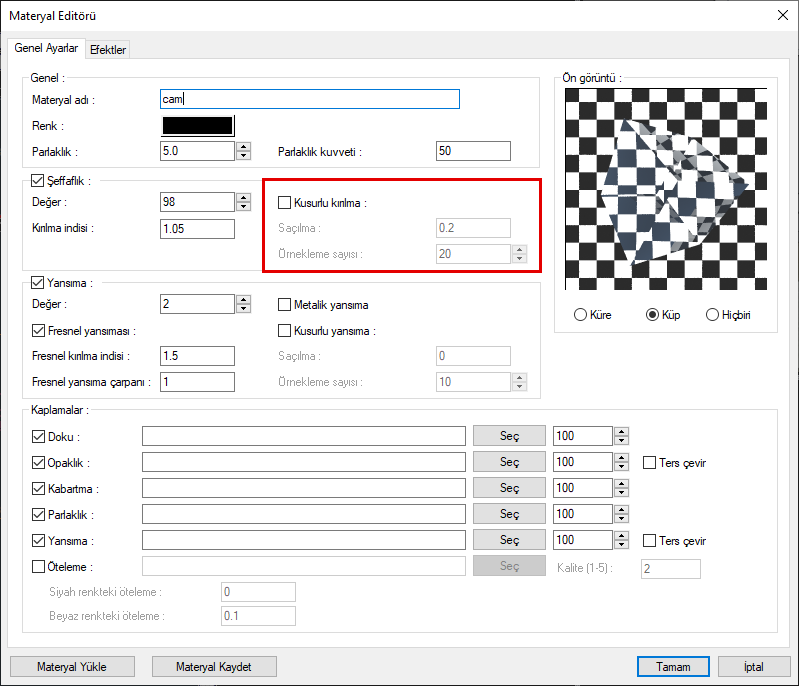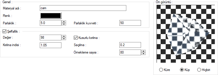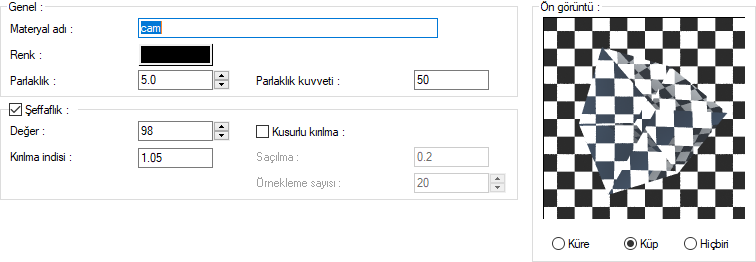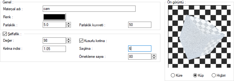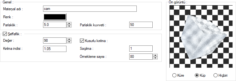 Materyal editörü diyaloğu genel ayarlar sekmesi şeffaflık bölümünden kusurlu kırılma özelliğine ulaşabilirsiniz.