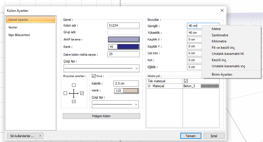 Herhangi bir diyalog içerisinde, yazı kutusu üzerinde "farenin sağ tuşuna" tıklanarak birim listesi açılır, herhangi bir anda çalışma birimi değiştirilir.