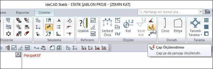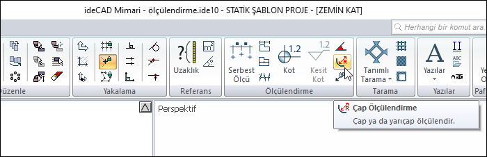 Çap ölçülendirme komutu daire, yay, çember şeklindeki objelerin çapını ya da yarıçapını hesaplar. Obje üzerinde ölçüyü gösterir. Plan ve 2 boyutlu çizim pencerelerinde kullanılır.