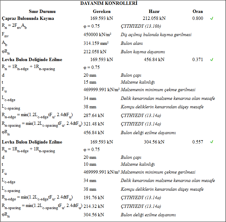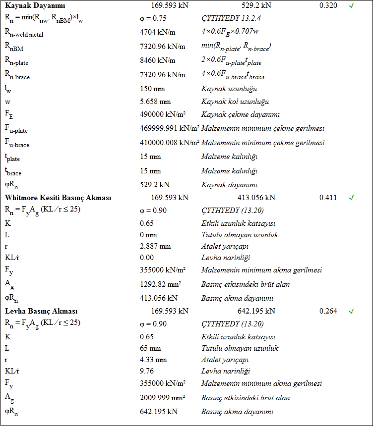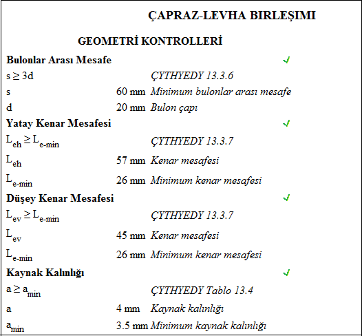 Çapraz uç birleşimi tasarımı Çelik Yapıların Tasarım, Hesap ve Yapım Esasları (ÇYTHYEDY), AISC 360-16, yönetmeliklerine göre otomatik yapılır ve birleşim raporu oluşturulur.