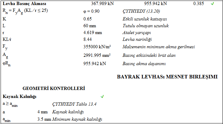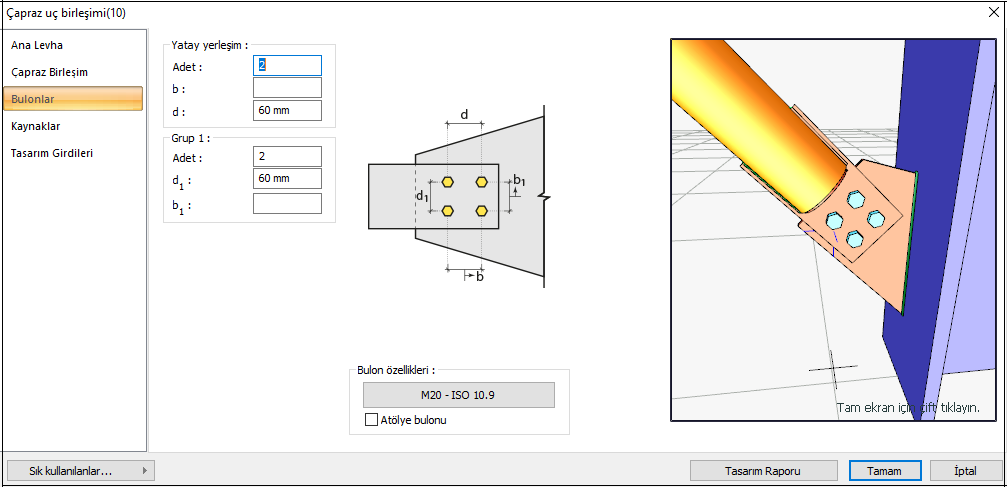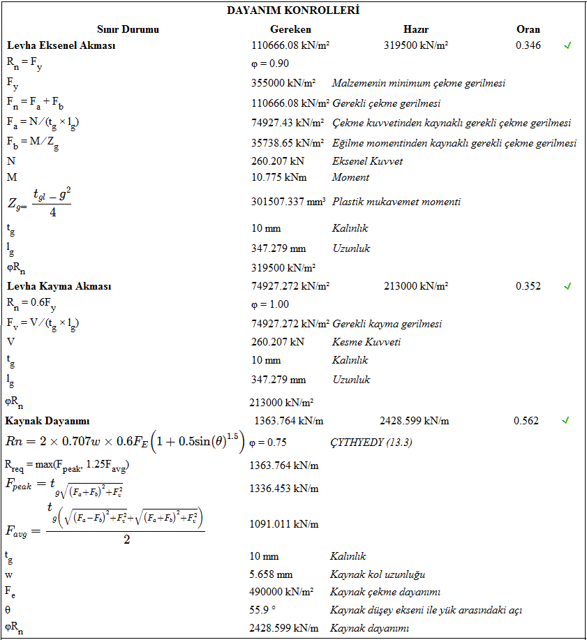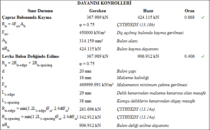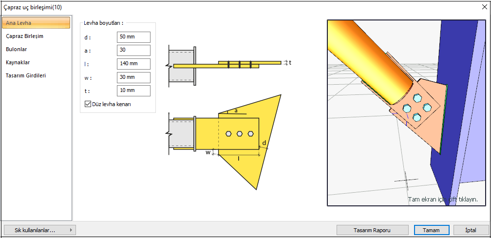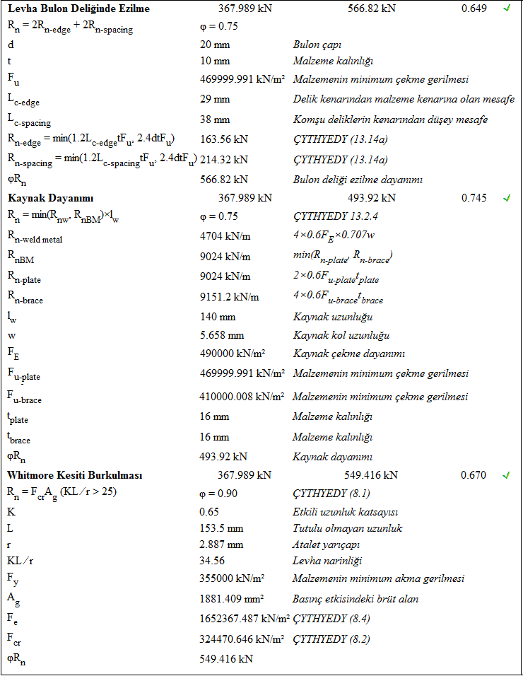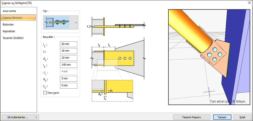 Çapraz uç birleşimi tasarımı Çelik Yapıların Tasarım, Hesap ve Yapım Esasları (ÇYTHYEDY), AISC 360-16, yönetmeliklerine göre otomatik yapılır ve birleşim raporu oluşturulur.