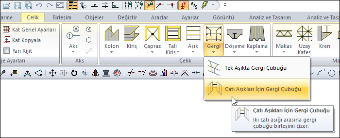 Çatı Aşıkları için Gergi Çubuğu komutuyla çatıda her iki yönden gelen aşık grupları arasında gergi çubuğu tanımlanır.