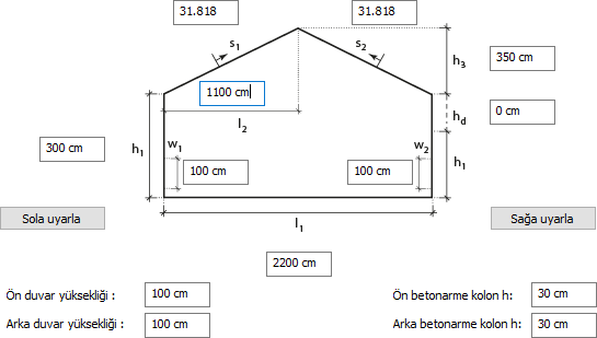l2 kutusuna çatının tepe mahyasının yerini belirlemek için istediğiniz değeri girin. Program s1 ve s2 eğim değerlerini otomatik verecektir.