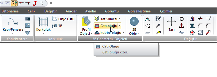 Çatı Oluğu komutuyla seçili profille, varsayılan olarak çatı kenarlarında bir obje oluşturulur.