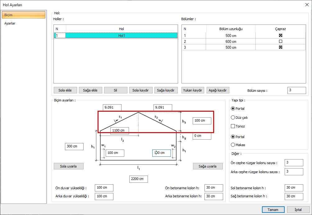 Çatı yüksekliği ayarı ile hol ayarları diyaloğu biçim ayarları bölümünden, seçilen holün çatı yüksekliği değiştirilir.