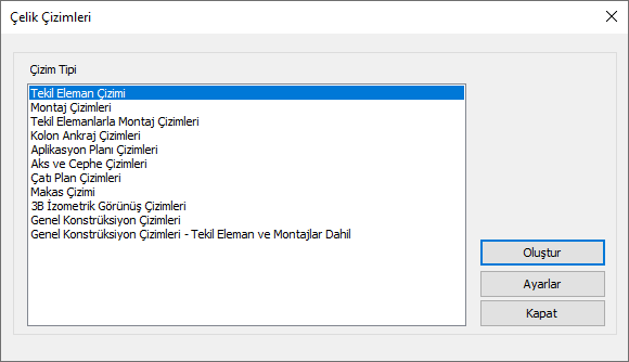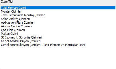 Çizim tipi ![]() Çelik çizim tipleri listelenir. Oluşturulmak istenen çizim tipi listeden seçilir. |