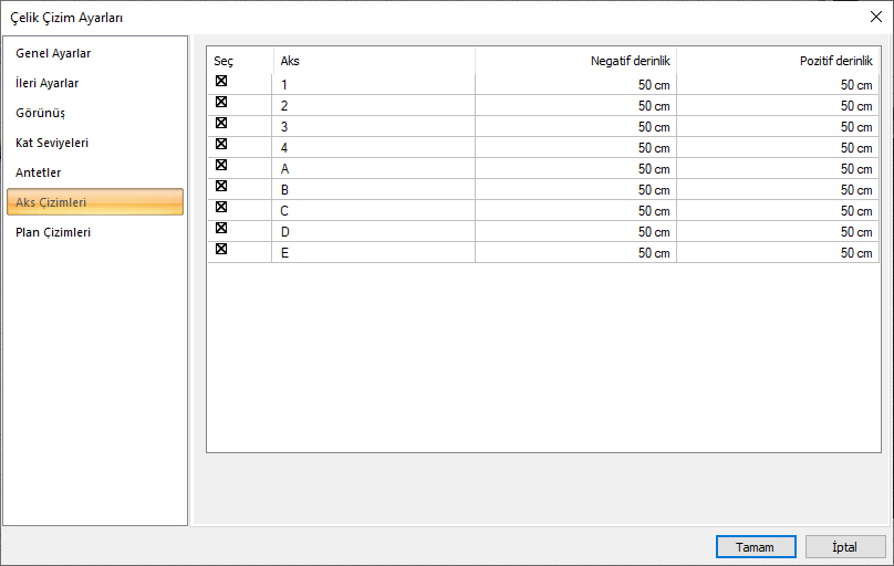 Ayarlar ![]() Çelik çizimlere ait çelik çizim ayarları diyaloğunu açar. |