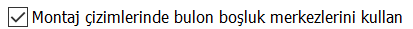 Montaj çizimlerinde bulon boşluk merkezlerini kullan ![]() İşaretlendiğinde; montaj çizimlerinde ölçülendirme yapılırken, ölçü referans noktası bulon deliklerinin ortası olarak alınır. |