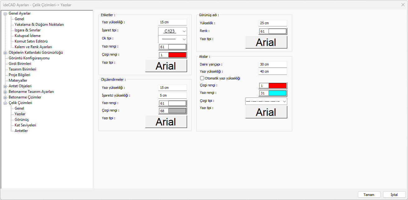 Çelik çizimlerine ait çizim rengi, ölçek, tanlo renkleri ve pafta ayarları düzenlenir.