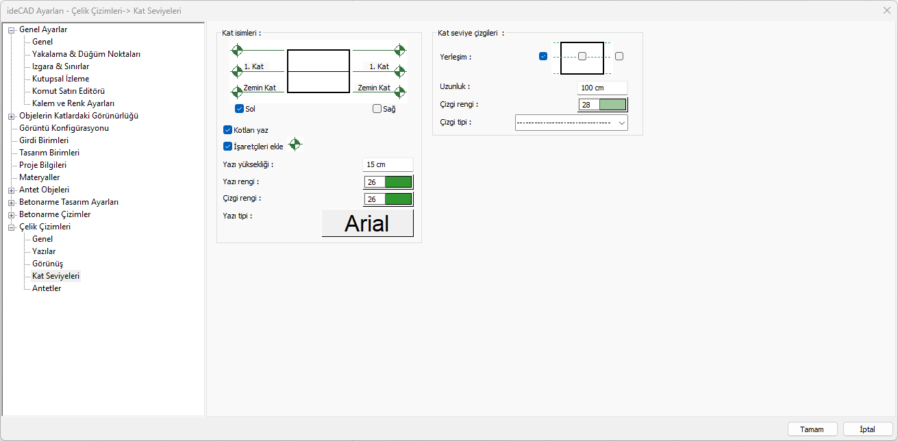 | Kat isimleri  Kesit veya görünüşte kat isimlerinin nasıl gösterileceğini gösteren seçenekleridir. |