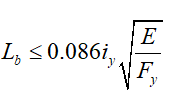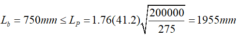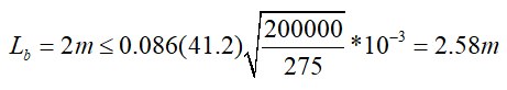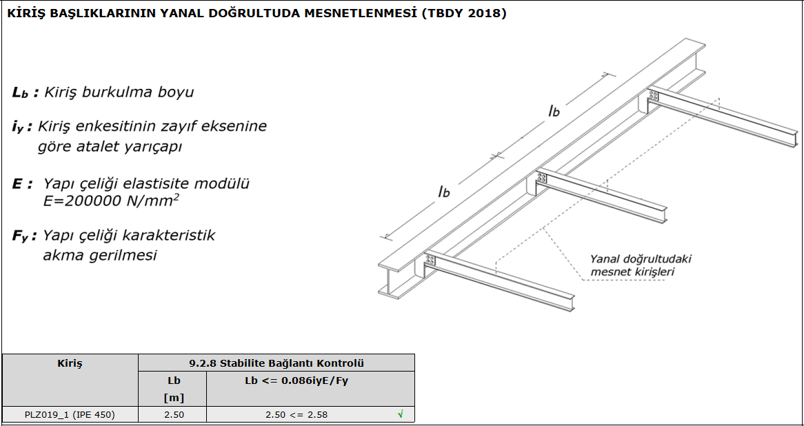 Yanal doğrultuda desteklenmemiş en uzun kiriş parçası Lb= 2.0 m ‘dir. TBDY 2018 9.2.8.1(a)’ya göre süneklik düzeyi yüksek kirişlerin alt ve üst başlıklarının desteklendiği noktalar arası uzaklık, Lb şu koşulu sağlamalıdır.