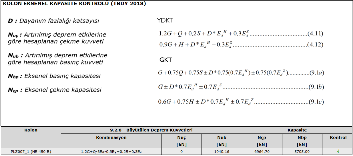 Yukarıda birleşik etkiler altında tasarım için hesapladığımız eksenel basınç kapasitesinin yanı sıra TBDY 9.3.1.3 gereği eksenel çekme kuvvetinin de kontrolü gerekir. Bu kontrolde dikkat edilmesi gereken husus analizden elde edilen yatay deprem etkilerinin D, dayanım fazlalığı katsayısı, ile arttırılma zorunluluğudur.