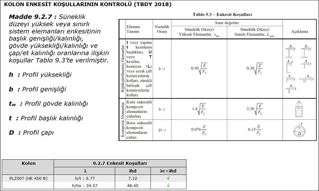 Enkesit koşulu kontrolü, çelik kolon raporunda TBDY 2018 Tablo 9.3’e göre yapılır ve tablo halinde özetlenir.