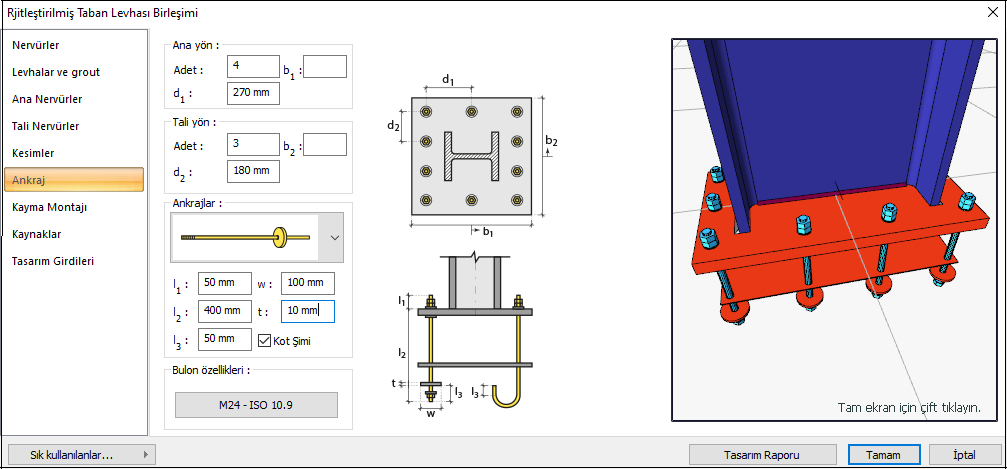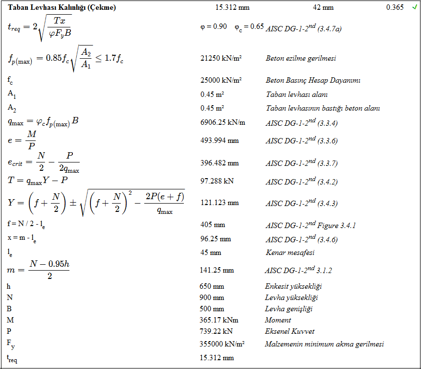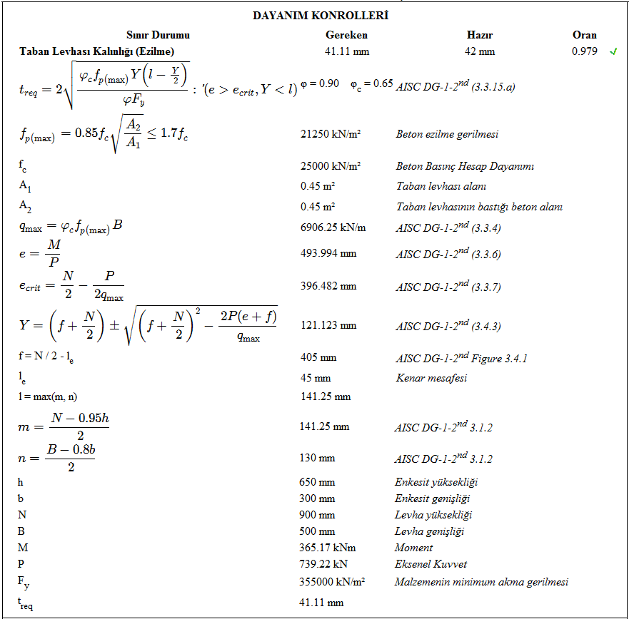 Çelik Kolon Ayağı Birleşimi veya Kolon-Temel Birleşimi tasarımı Çelik Yapıların Tasarım, Hesap ve Yapım Esasları (ÇYTHYEDY), AISC 360-16, AISC 358-16 ve TBDY yönetmeliklerine göre otomatik yapılır ve birleşim raporu oluşturulur.