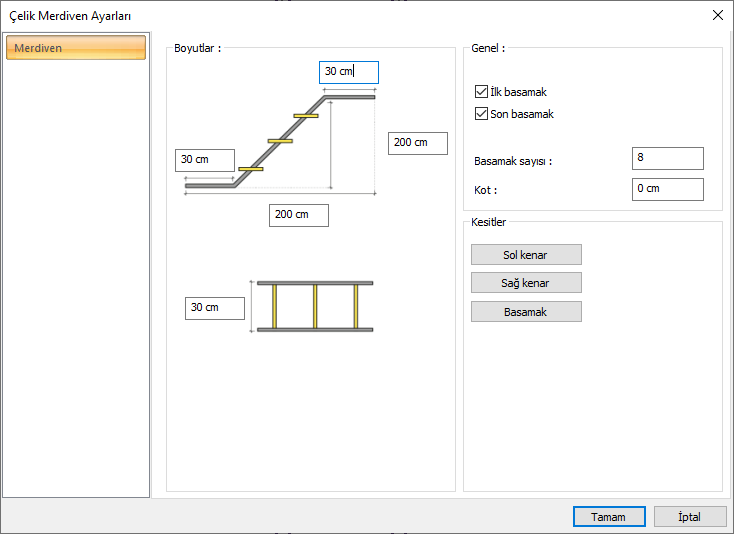 Basamak ![]() Merdiven basamak kiriş ayarlarını açarak kesit seçimi yapılır. |