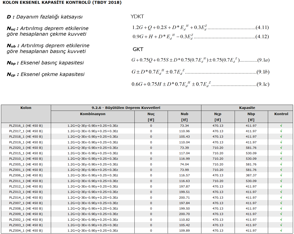 Çelik kolon raporlarında çekme ve basınç kuvvetlerinin hesabında depremli yük bileşenleri D ile arttırılır ve kapasite kontrolü gerçekleştirilir.