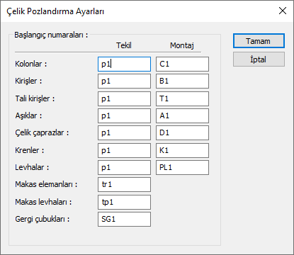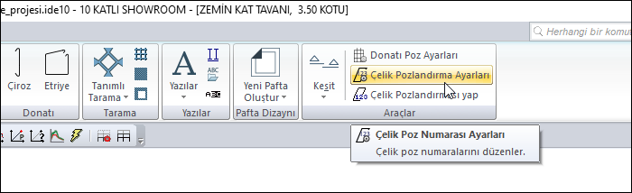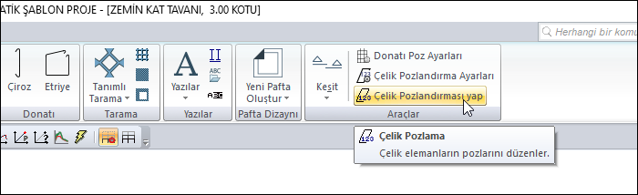 Çelik elemanların ve detayların benzer parçalarının gruplanarak pozlandırılması Çelik Pozlandırması Yap komutu kullanılarak gerçekleştirilir. Pozlandırma yapmadan önce Çelik Pozlandırma Ayarları komutu ile başlangıç numaraları isteğe göre belirlenir.