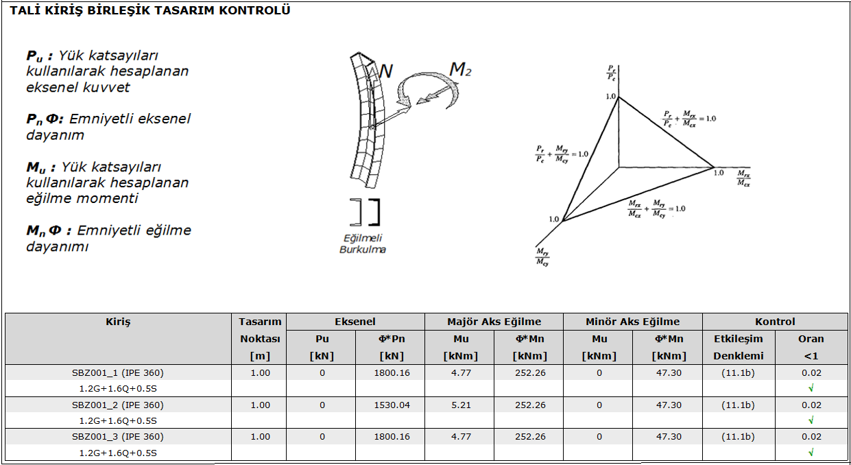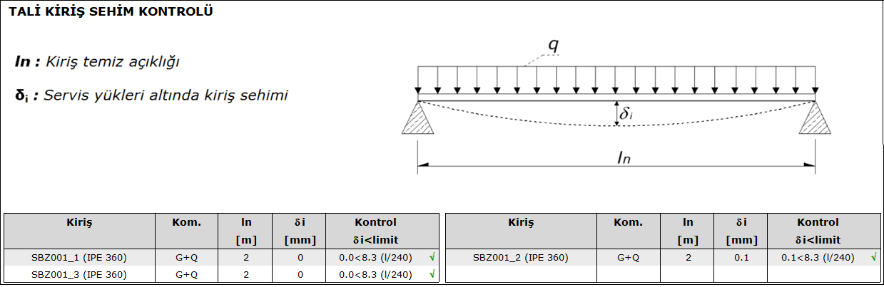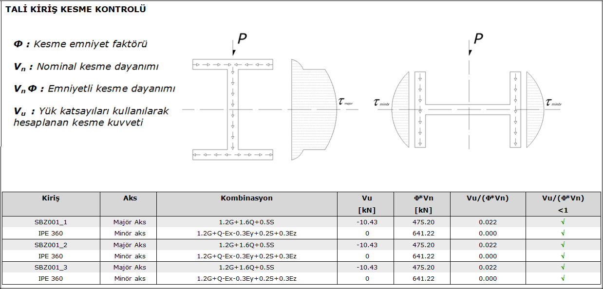 Sehim kontrolü sonuçları tali kiriş raporu üzerinden kontrol edilmektedir.