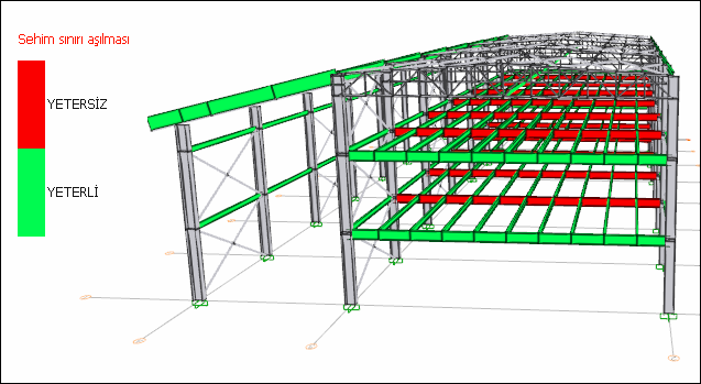 | Sehim sınırı aşılması  Sehim sınırını aşan elemanlar görünüş penceresinde kırmızı renkte boyanır.  |