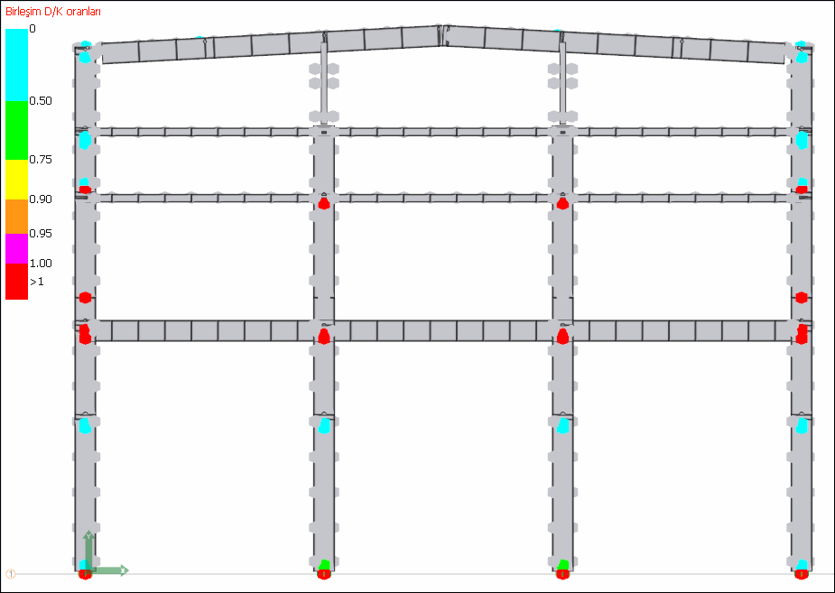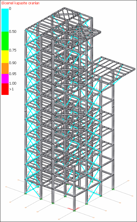 | Eksenel kapasite oranları  Farklı eksenel kapasite oranlarına sahip elemanlar görünüş penceresinde farklı renklerde boyanır. Ekranın solunda yer alan renk skalasından hangi rengin hangi oranı temsil ettiği görülebilir.  |