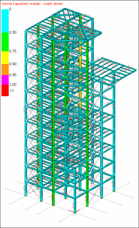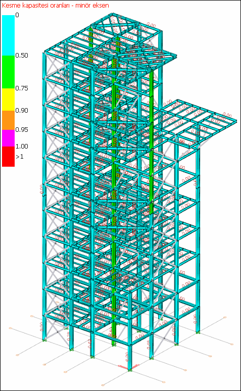 | Kesme kapasitesi oranları-minör eksen  Minör eksende farklı kesme kapasitesi oranlarına sahip elemanlar görünüş penceresinde farklı renklerde boyanır. Ekranın solunda yer alan renk skalasından hangi rengin hangi oranı temsil ettiği görülebilir.  |