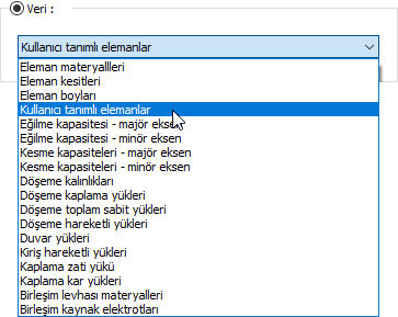 | Veri  Listede yer alan seçeneklerinden herhangi biri seçilerek görünüş penceresine yer alan yapı modeli üzerinde kullanıcı tarafından belirlenen verilerin gösterilmesi sağlanabilir. |