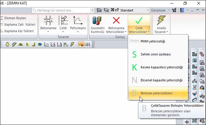 Ribbon menü Analiz ve Tasarım Görüntüleme sekmesi Sonuç başlığı Çelik Yetersizlikler komutu altında yer alan komutlardan birine tıklayarak Çelik Tasarım sekmesinden ulaşabilirsiniz.