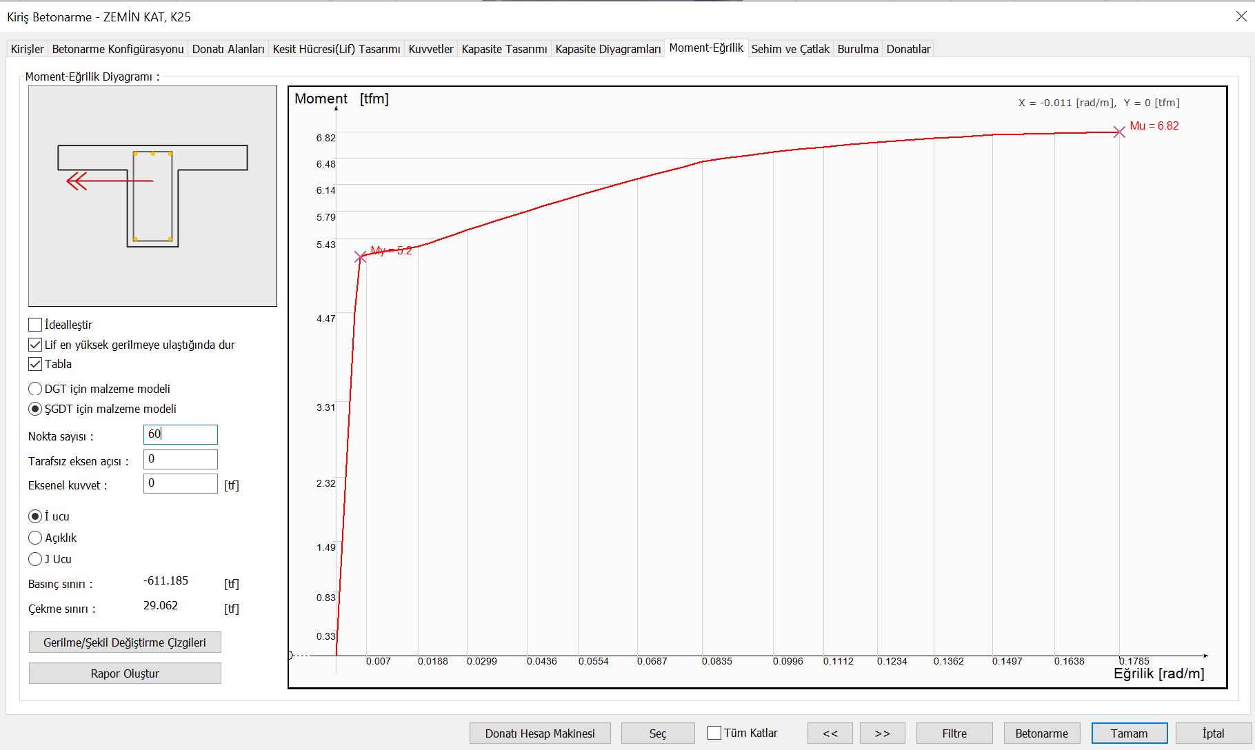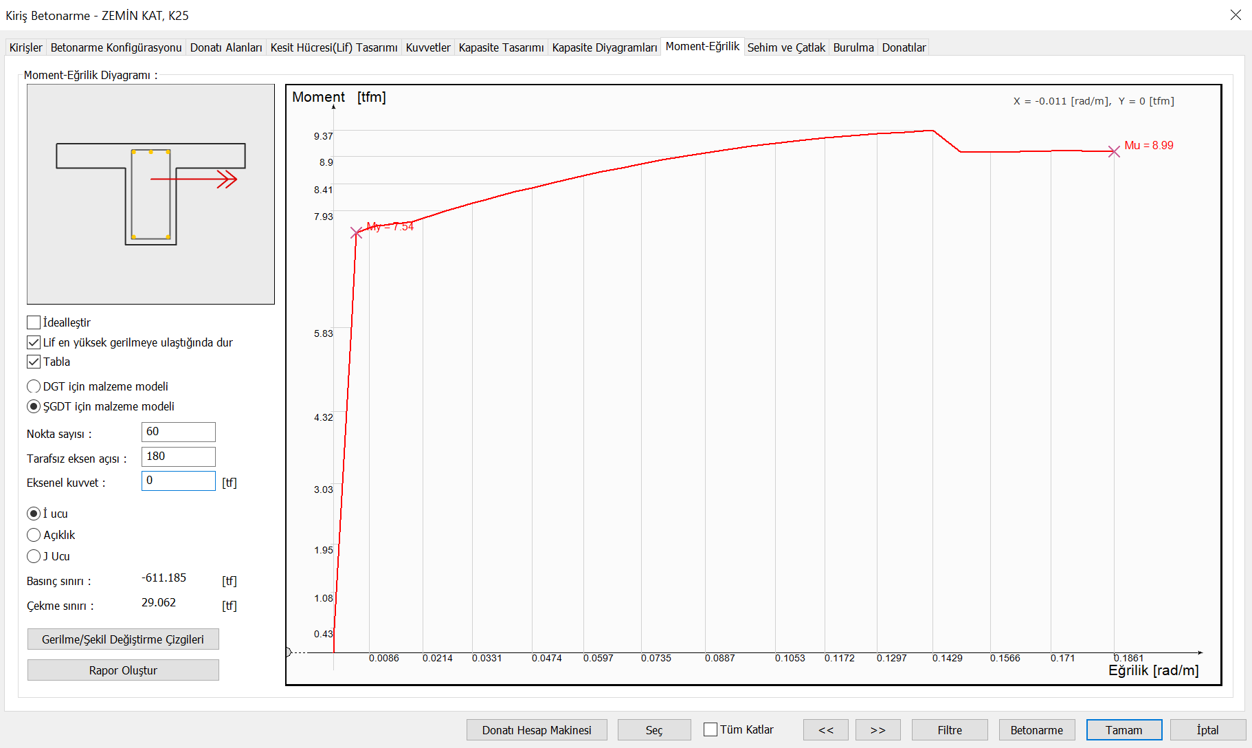 Akma momentleri moment-eğrilik ilişkisi kullanılarak otomatik hesaplanır.