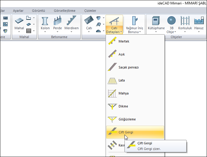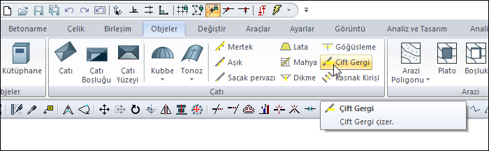 Çift gergi komutuna ribbon menü Objeler sekmesi Çatı başlığı altından ulaşabilirsiniz.