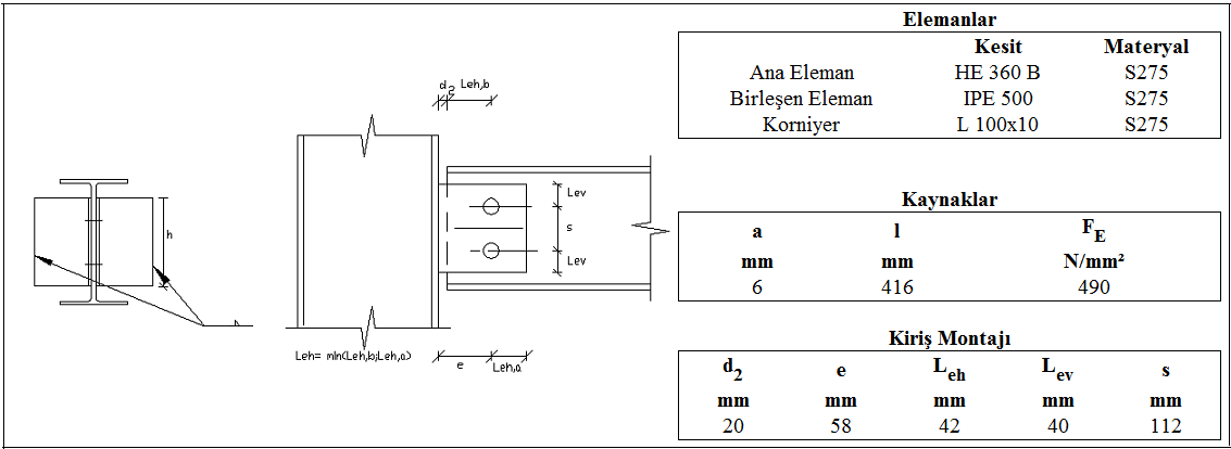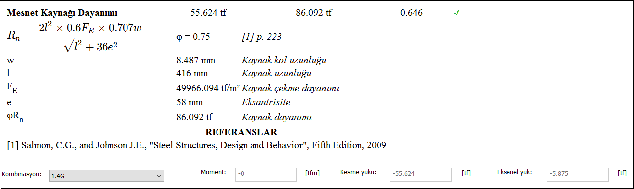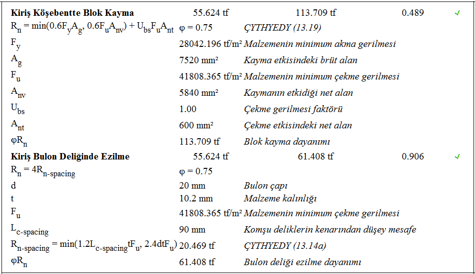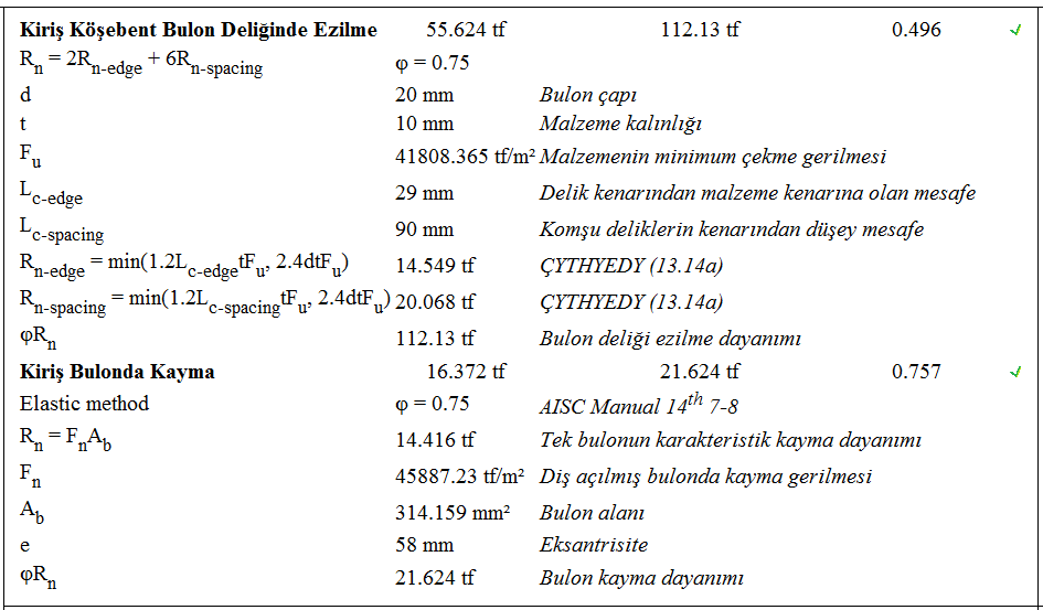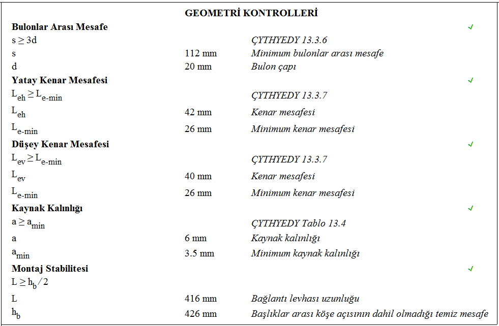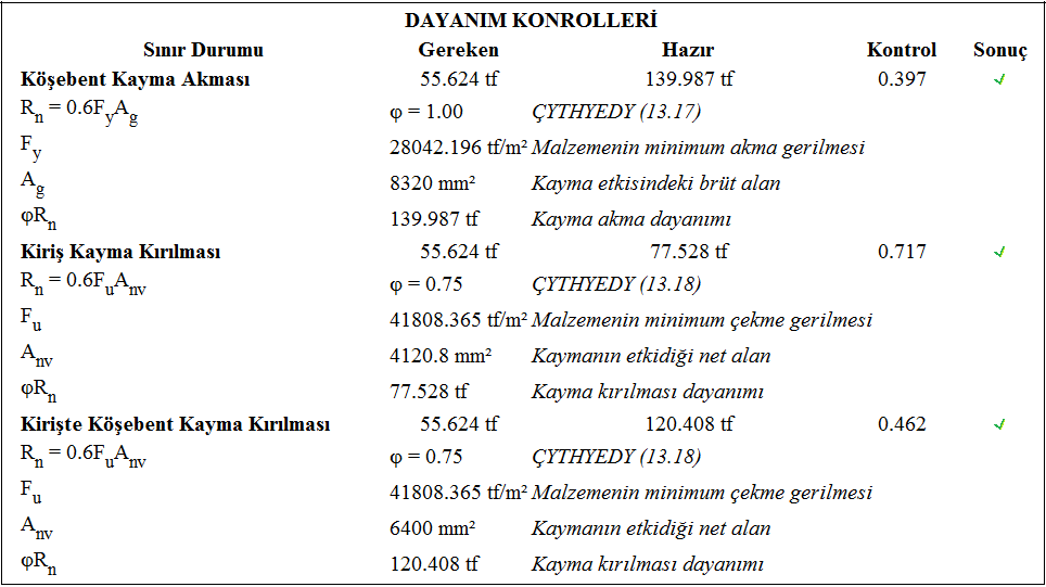 Çift köşebentli birleşim raporunda Çelik Yapıların Tasarım, Hesap ve Yapım Esasları (ÇYTHYEDY) (GKT ve YDKT) veya AISC 360-16 (ASD ve LRFD) yönetmeliklerine göre tasarımı yapılan birleşimin kontrolleri verilir.