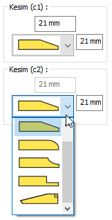Kesimler (c1, c2) ![]() Levhaların sahada kolay montajı için şev kullanılmasına, şev tipine ve geometrik özellikleri değer girilerek belirlenir. |