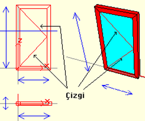 Çizgiler ile plan/görünüş pencerelerinde açılış yönü gibi çizim detayları verilir. Çizgilerin tanım ve düğüm noktaları aynı ve 2 tanedir.