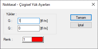 Çizdiğiniz çizgisel radye yükü üzerine farenin sol tuşu ile çift tıklayarak Noktasal-Çizgisel Yük Ayarlarına ulaşabilirsiniz.
