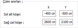 Çizim sınırları ![]() Sol alt ve sağ üst köşe için değerler girilerek çizim sınırları belirlenir. |